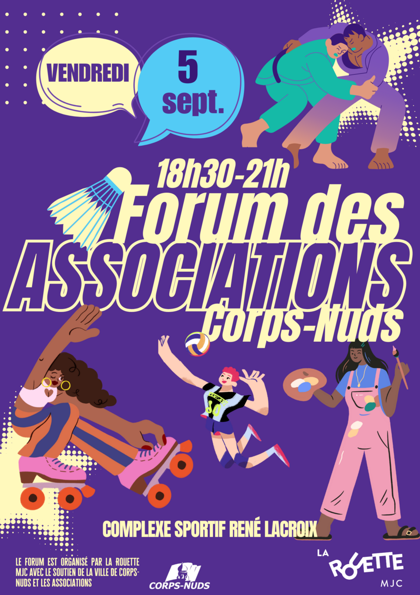 comme chaque année la Rouette MJC se charge de l'organisation du forum des associations qui aura lieu VENDREDI 5 SEPTEMBRE 2025 de 18h30 à 21h à LA SALLE DES SPORTS de Corps Nuds.